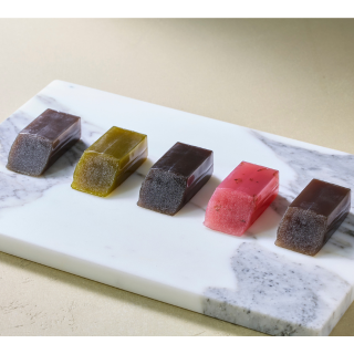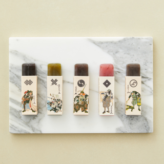 歌川国芳の武者絵の小箱に5種類の味(本練、桜、塩、黒糖、抹茶)のようかんを詰めました。