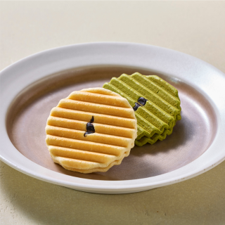 生地は、バニラと抹茶で当店では、表面の波型を「愛宕神社の出世の石段」に見立てている地元菓子です。