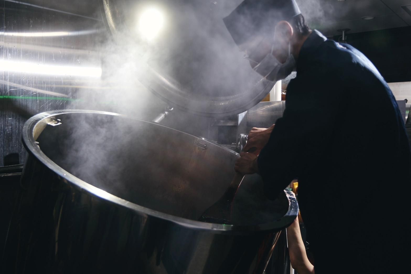 切腹最中のあんこは、製法の常識にも切り込み、一般的には生の小豆を洗い一晩水に浸け、翌日水から炊き、煮汁を捨てる作業(渋切)を何度か繰り返す製法だが、新正堂では小豆を水に浸さずグツグツと沸騰した湯の中に生の小豆をザーッと一気に入れて煮ていく『真空直火炊き』で煮ています。